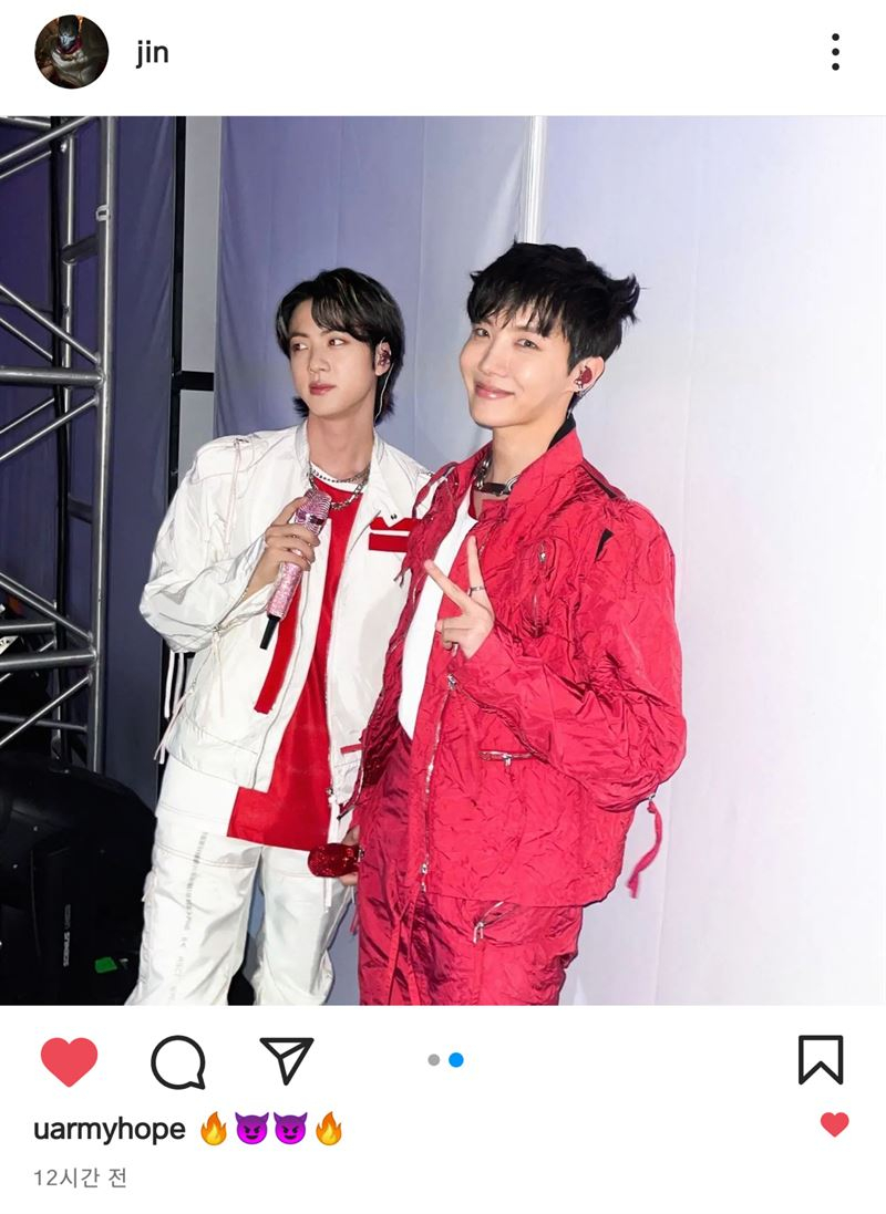 방탄소년단(BTS) 진이 멤버 제이홉과 함께한 시간을 공개, 팬들에게 커다란 행복을 안겼다.