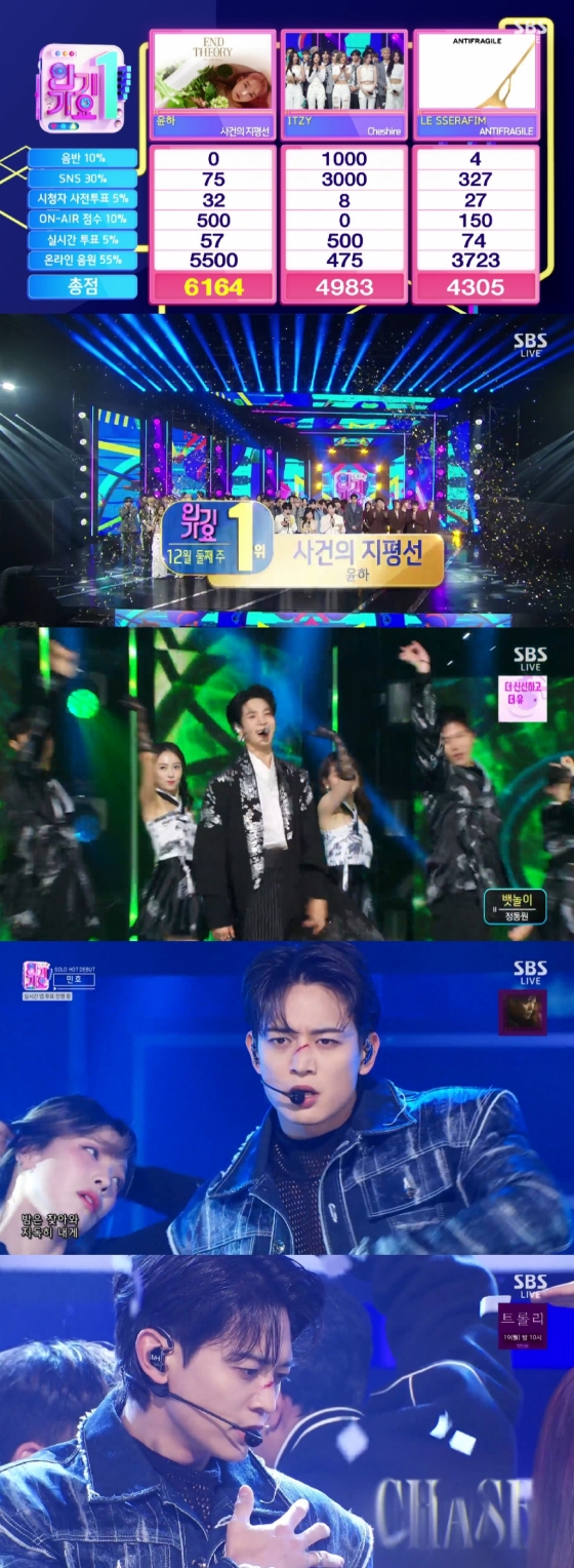 11일 방송된 SBS '인기가요'에서 윤하의 '사건의 지평선', 르세라핌의 'ANTIFRAGILE', 있지의 'CHESHIRE'가 12월 둘째 주 1위 후보로 올랐다.