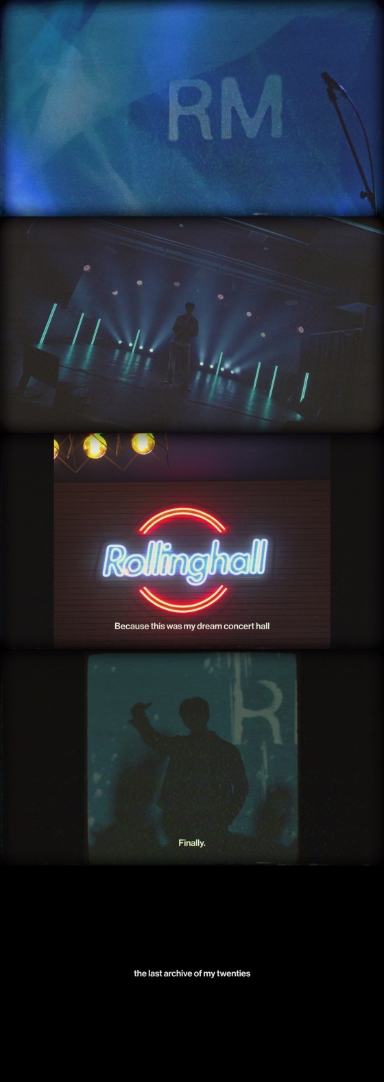 마침내 무대에 오르는 RM의 뒷모습과 함께 'the last archive of my twenties'(나의 20대의 마지막 기록)라는 문장이 새겨지며 본편에 대한 기대감을 높인다.
