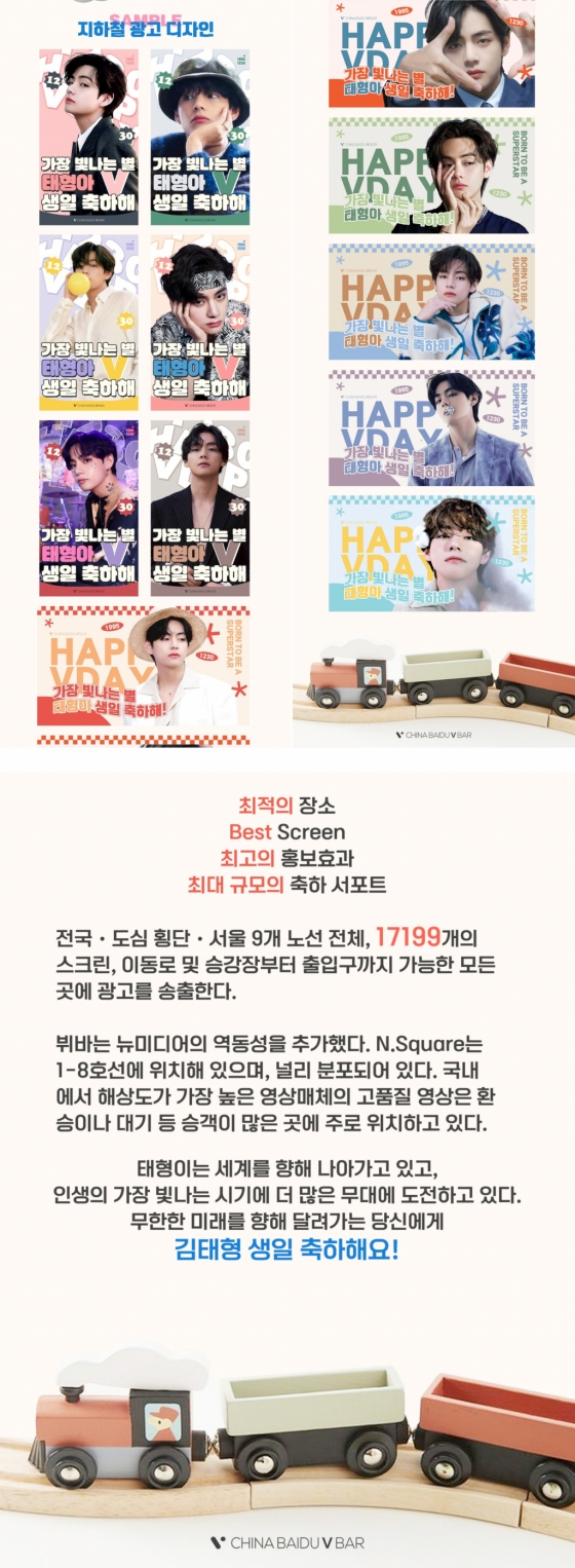 바이두뷔바는 "태형이는 세계를 향해 나아가고 있으며 인생의 가장 빛나는 시기에 많은 무대애 도전하고 있다. 무한한 미래를 향해 달려가는 태형이의 생일을 축하한다"는 메시지와 함께 전국 지하철역 1만 7199개의 대형 광고판에 뷔의 생일 축하 영상을 띄운다고 발표했다.