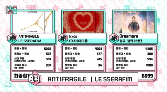 이날 르세라핌의 '안티프래자일'(ANTIFRAGILE)은 (여자)아이들의 '누드'(Nxde), 방탄소년단 정국의 '드리머스'(Dreamers)를 꺾고 정상에 올랐다.