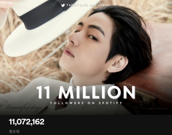 방탄소년단(BTS) 뷔가 세계 최대 음원 플랫폼 스포티파이(Spotify)에서 1100만 팔로워 대기록을 세우며 글로벌 인기를 빛냈다.