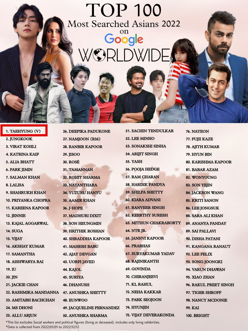 세계 빅데이터 분석의 3분의 1이상을 담당하고 있는 인도의 다수 매체의 발표에 따르면 뷔는 2022년 1월 1일부터 12월 12일까지 수집된 데이터를 기반으로, 구글에서 '가장 많이 검색된 아시아 셀럽 톱 100' 1위에 선정됐다.