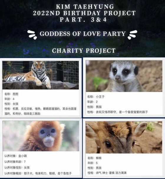 바이두 뷔바는 뷔의 생일을 축하하며 중국 난징 홍산 삼림동물원에서 뷔와 팬들의 이름으로 동물을 입양했다고 전했다.