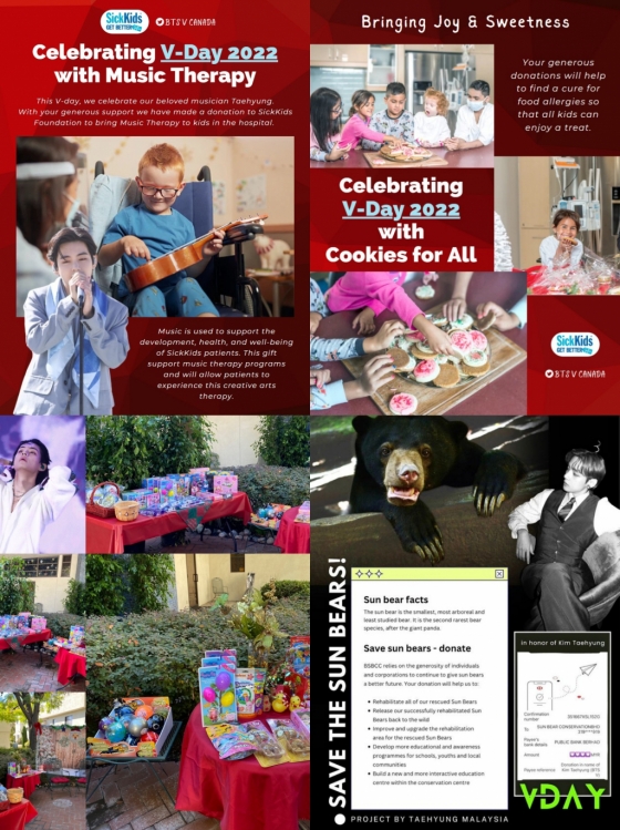 뷔의 캐나다 팬 베이스 'BTS V Canada'는 어린이 환자들의 웰빙과 발달을 돕는 'Sick kids foundation'의 두 가지 프로젝트에 각각 성금을 전달했다.