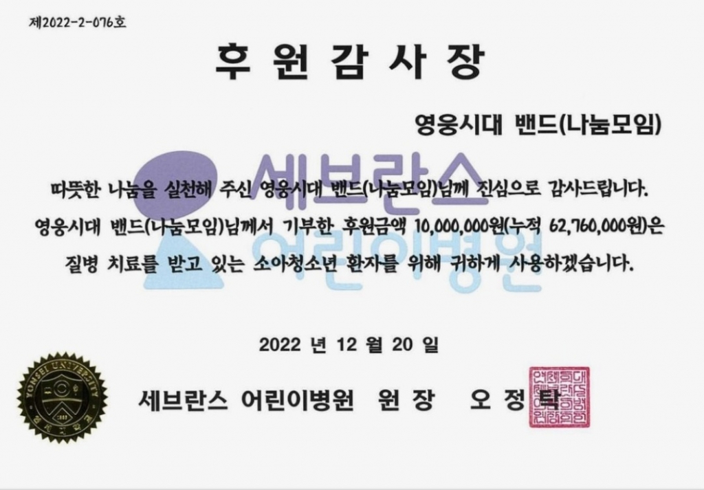 임영웅 팬클럽 영웅시대밴드 나눔모임은 12월 20일 경제적 어려움이 있는 어린이 환자를 위해 세브란스 어린이병원(원장 오정탁)에 1000만 원을 기부했다.