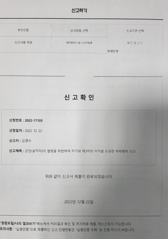 끝으로 김영수 소장은 "비록 이 사건이 별 것이 아닐수도 있지만, 당사자의 잘못으로 인하여 우리 군의 명예가 더 이상 실추되지 않도록 공식적인 사과를 바라는 차원에서 이러한 부패신고를 결심하게 됐다"고 전했다.