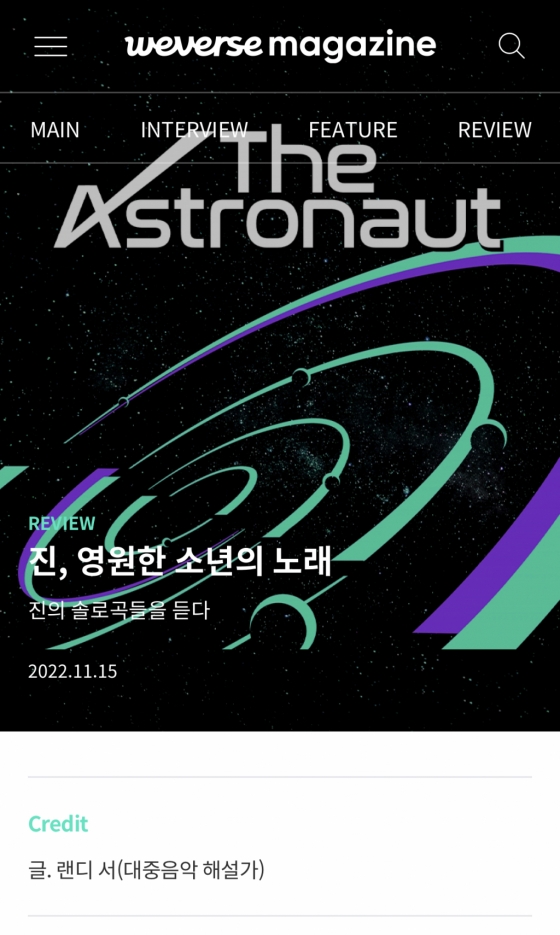 건강하고 올곧은 자존감과 따뜻하면서도 유쾌한 친밀감을 '자기 자비'를 실천한다고 표현하며 진의 내적 아름다움을 재조명했던 대중음악 평론가 랜디 서가 위버스 매거진(Weverse Magazine)을 통해 이번에는 진의 음악 세계를 재조명했다.