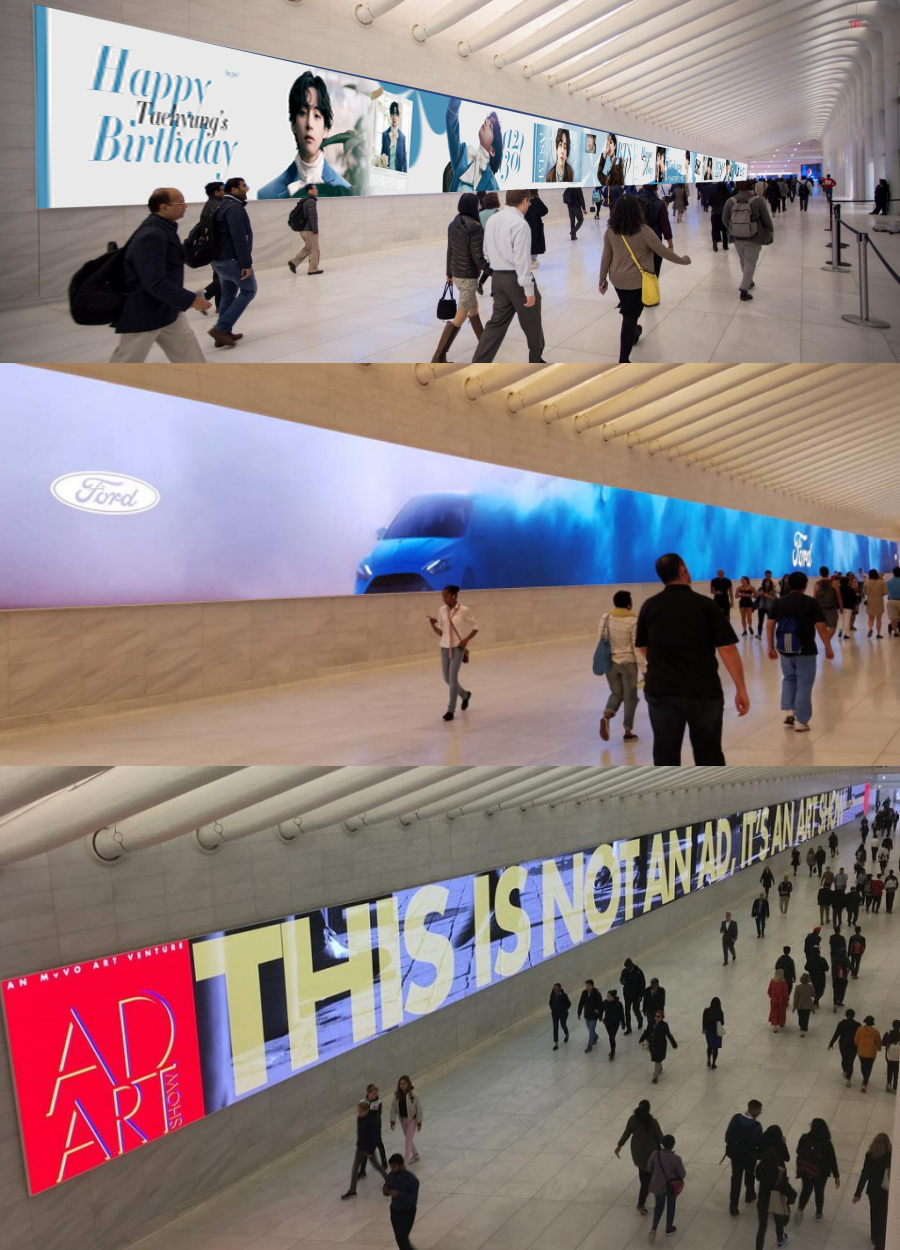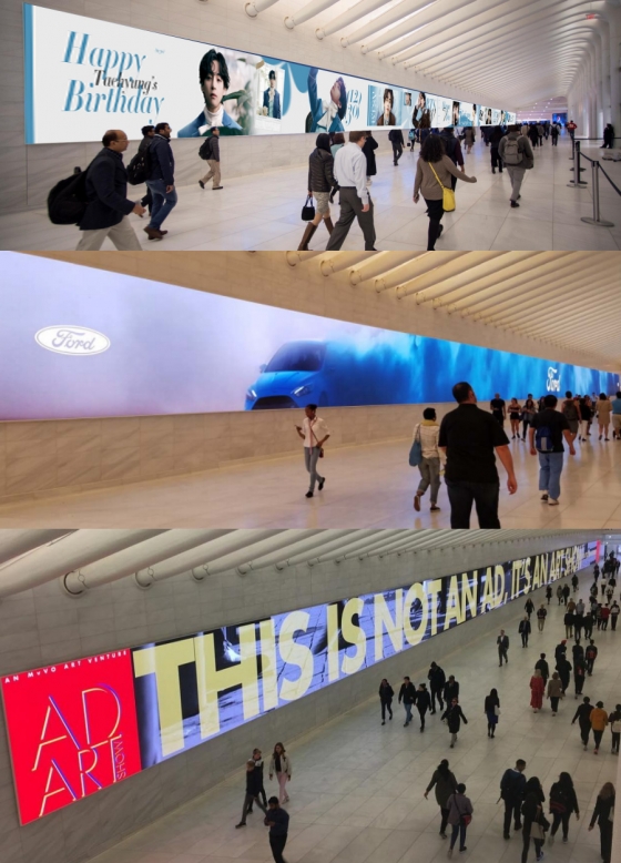 뷔의 광고는 중앙홀 통로에 위치한 100야드(약 91m) 길이의 초대형 스크린(E/W Gallery)을 비롯 건물 곳곳의 22개 스크린 세트 전체에서 동시에 진행된다.