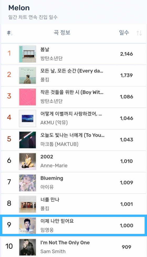 임영웅은 12월 30일 기준 국내 주요 음원 플랫폼 멜론(Melon) 일간 차트에 1000일째 진입했다.