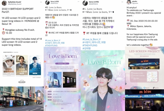 팬 계정 'ginsthv'는 뷔의 생일에 인도네시아 자카르타의 복합 문화공간 M Bloc Space에 뷔의 노래가 함께 재생되는 LED 광고를 진행했다.