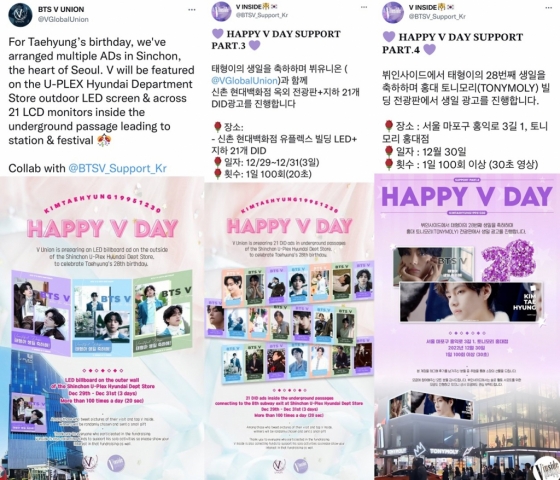 뷔의 글로벌 팬베이스 'BTS V UNION'과 한국 팬베이스 'V INSIDE'는 신촌 현대백화점 유플렉스 빌딩 옥외 전광판에 대형 LED 영상 광고와 지하 연결 통로에 21개 DID 광고를 게재한다. 12월 29일부터 31일까지 진행하며 하루 200회 이상 뷔의 모습을 볼 수 있다.