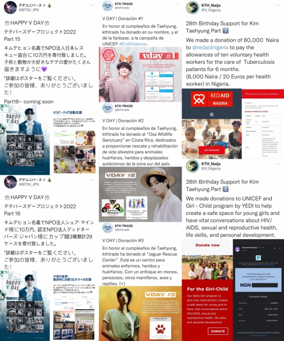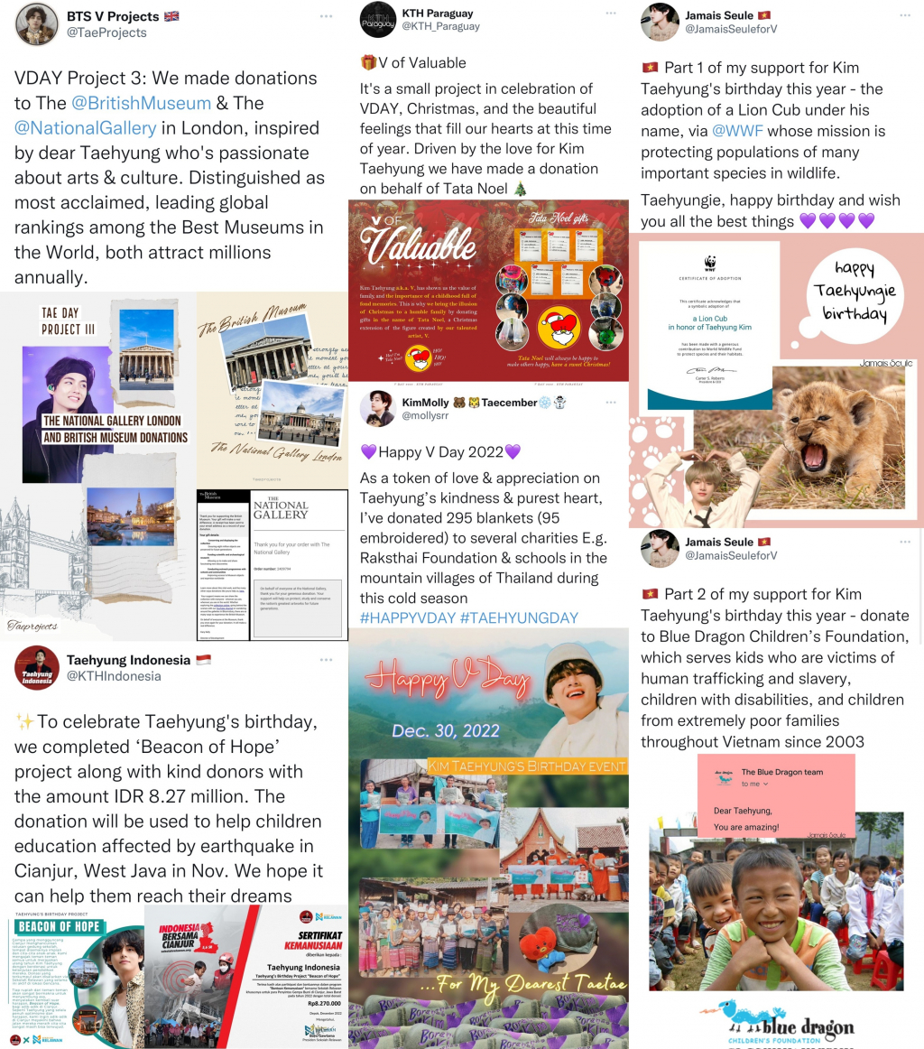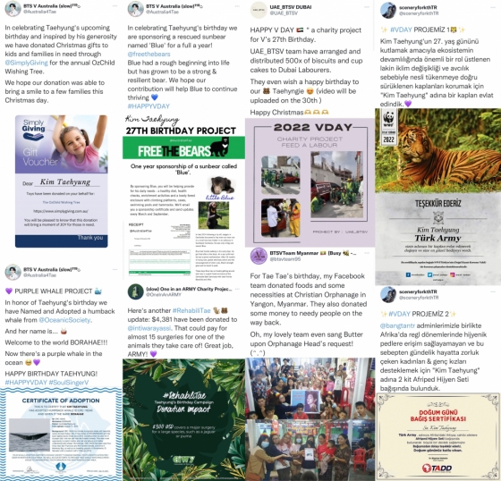 'KTH Paraguay'는 뷔의 생일과 크리스마스를 맞아 '타타 노엘'의 이름으로 어려운 가정에 선물을 기부, 'BTSVTeam Myanmar'는 양곤에 있는 기독교 고아원에 음식과 생필품을, BTSV_Myanmar'는 양곤의 고아 아동 청소년 복지센터 음식을 전했고, 'UAE_BTSV DUBAI'는 두바이 노동자들에게 감사하는 마음을 전하기 위해 간식을 기부했다.