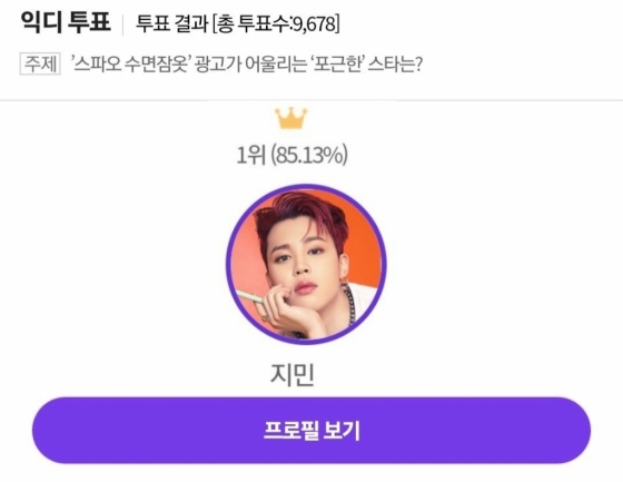 지민이 12월 25일부터 12월 31일까지 익사이팅 디시에서 진행된 '스파오 수면 잠옷 광고가 어울리는 포근한 스타는?'' 설문에서 1위를 차지했다.