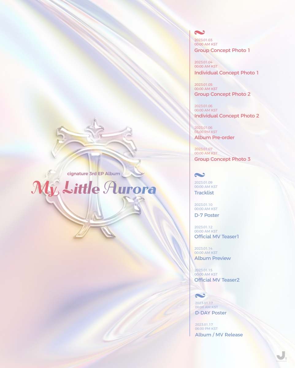 시그니처(채솔, 지원, 셀린, 벨, 세미, 도희, 클로이)는 2일 0시 공식 SNS를 통해 세 번째 EP 앨범 'My Little Aurora(마이 리틀 오로라)'의 타임테이블 이미지를 공개했다.