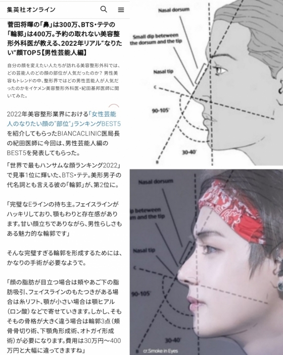 매체는 "남성미용도 트렌드인 가운데 어느 연예인의 어떤 얼굴 부위가 인기인가"라며 "'세계에서 가장 잘생긴 얼굴 랭킹 2022' 1위를 차지한 미남의 대명사격인 뷔의 얼굴형이 뽑혔다"고 전했다.