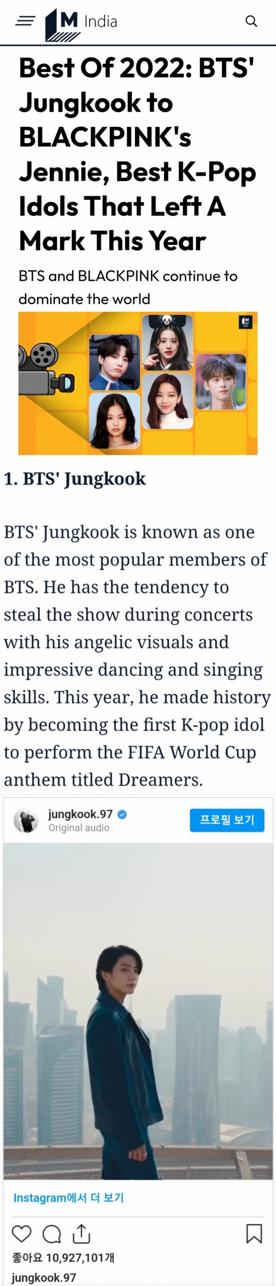 미국 매체 매셔블(Mashable) 인도는 최근 2022년을 빛낸 재능 있고 다재다능한 '최고의 K팝 아이돌'을 선정해 보도했다.