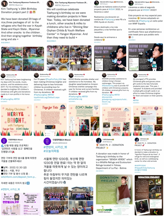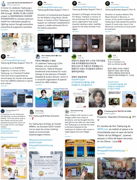방탄소년단(BTS) 뷔의 생일(12월 30일)을 기념하는 전 세계 팬들의 기부 행렬이 끊임없이 이어지며 선한 영향력을 빛냈다.