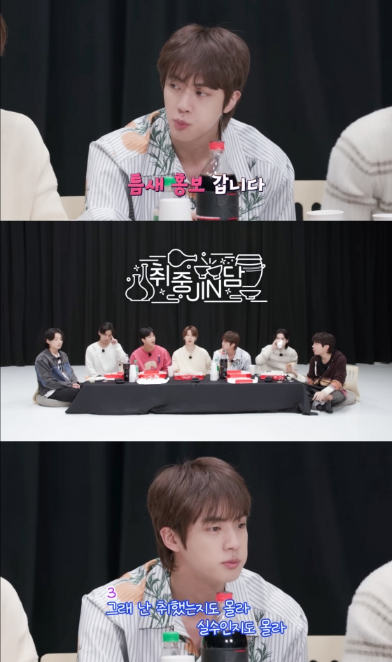 진은 멤버들과 함께 백종원이 보내준 피자를 맛있게 나눠먹으며 백종원과 함께한 유튜브 예능 '취중JIN담'을 많이 시청해달라는 틈새 홍보도 잊지 않는 센스를 발휘했다.