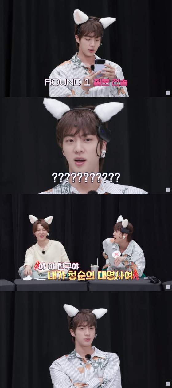 다음 질문인 '나는 상큼한 과즙상이다'에는 X를 들었다. 진은 멤버 정국이 두리안 쪽 과즙상이라며 공격을 하자 "야 이 친구야, 내가 청순의 대명사여~ 우리팀의 청순함은 나밖에 없지~ 라며 외모에 대한 자신감을 내비쳤다.