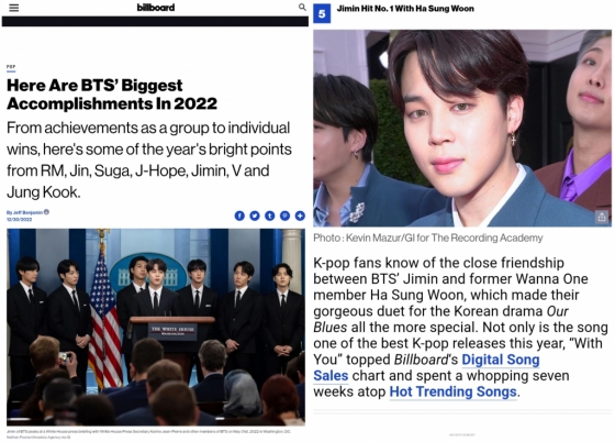 그런가 하면 빌보드는 2022년을 마무리하며 조명한 이번 보도에서 전체 세계 음반 산업을 대표하는 단체인 국제음반산업연맹이 수여하는 '올해의 글로벌 음반 아티스트상' 2년 연속 수상과 빌보드 뮤직 어워즈 3관왕 수상, AMA 4년 연속 수상, 그래미 'Butter' 무대 등 굵직굵직한 그룹의 소식을 전하며 개인 성과로는 지민의 OST '위드 유'의 대히트를 다뤘다.