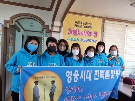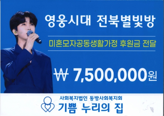 임영웅 팬클럽 영웅시대 전북별빛방은 1월 5일 전북 전주시 덕진구 미혼모 보호시설 '기쁨누리의집'(원장 김명희)에 미혼모 자립기반을 위한 지원금 750만 원을 후원했다.