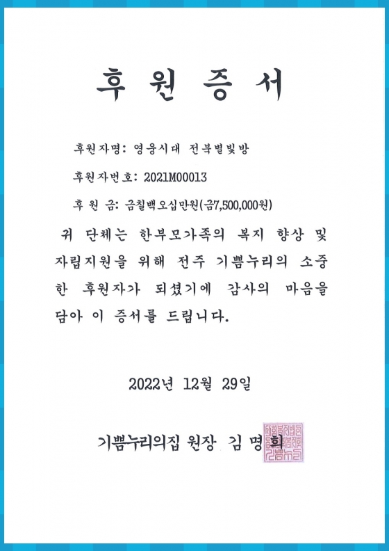 영웅시대 전북별빛방은 지난 2021년부터 '기쁨누리의집'에 2470여만 원 상당의 후원을 해오고 있다.