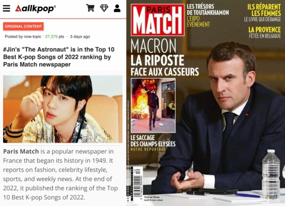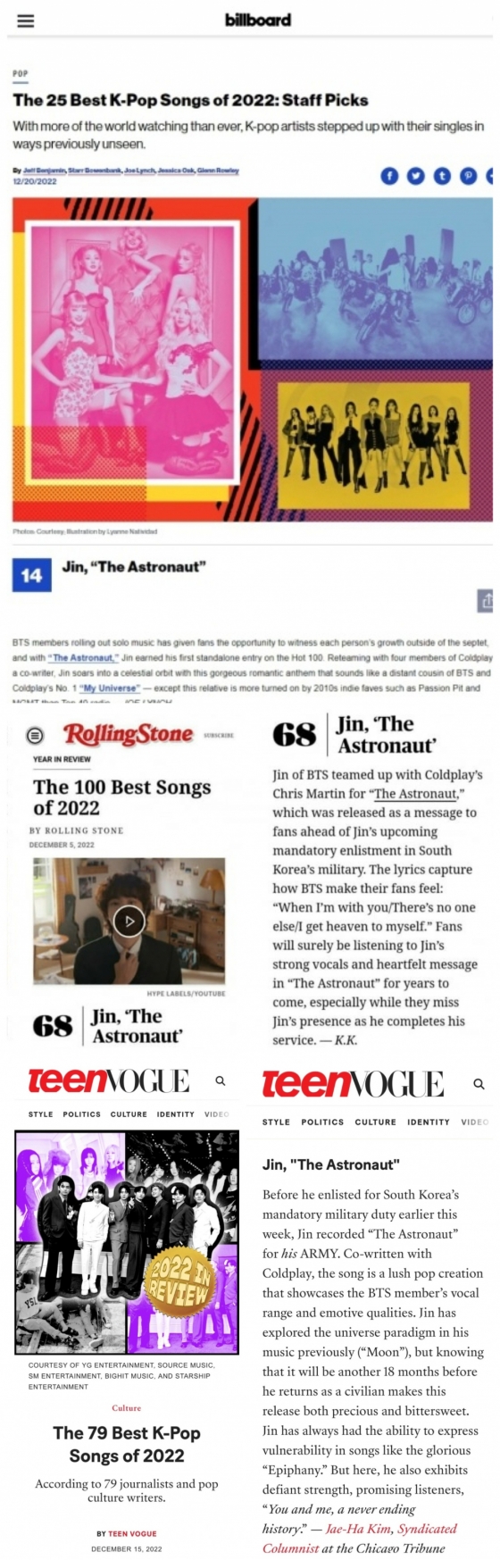 진의 '디 애스트로넛'은 프랑스 유력 매체 파리 매치(Paris Match)가 지난 12월 28일 발표한 2022년 최고의 K팝 송 톱10에서 4위에 올랐다.