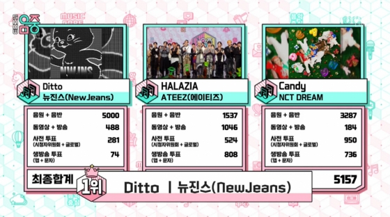 이날 1위 후보로는 뉴진스의 '디토'(Ditto), 에이티즈의 '할라지아'(HALAZIA), 엔시티 드림의 '캔디'(Candy)가 이름을 올렸다. 뉴진스는 방송에 출연하지 않았음에도 불구하고 높은 성적으로 1위해 눈길을 끌었다.