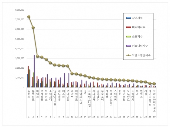 1위 뉴진스(민지, 하니, 다니엘, 해린, 혜인 ) 브랜드는 참여지수 1,375,300 미디어지수 2,217,183 소통지수 1,870,115 커뮤니티지수 1,836,676이 되면서 브랜드평판지수 7,299,275로 분석됐다. 지난 12월 브랜드평판지수 5,361,953과 비교해보면 36.13% 상승했다.