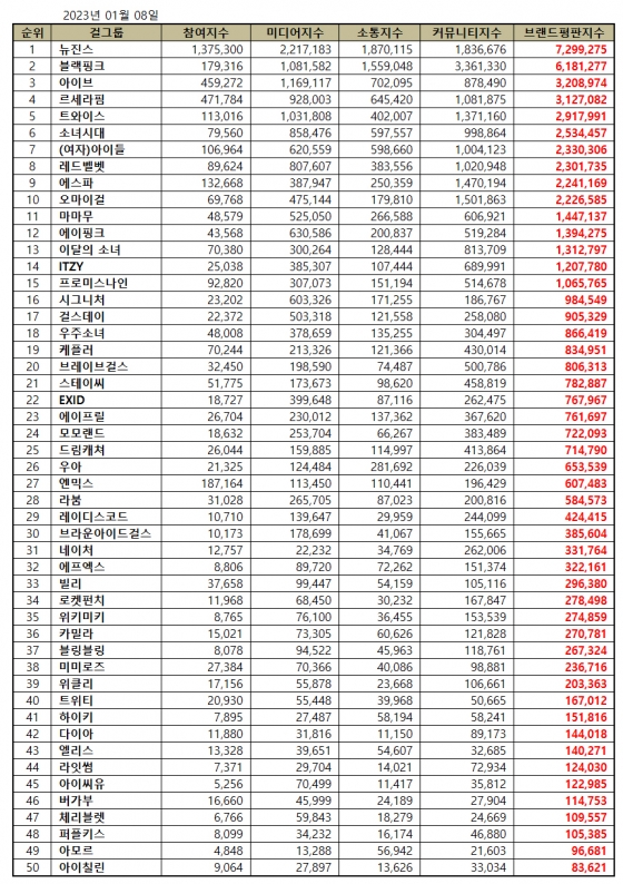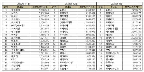 2023년 1월 걸그룹 브랜드평판 30위 순위는 뉴진스, 블랙핑크, 아이브, 르세라핌, 트와이스, 소녀시대, (여자)아이들, 레드벨벳, 에스파, 오마이걸, 마마무, 에이핑크, 이달의 소녀, ITZY, 프로미스나인, 시그니처, 걸스데이, 우주소녀, 케플러, 브레이브걸스, 스테이씨, EXID, 에이프릴, 모모랜드, 드림캐쳐, 우아, 엔믹스, 라붐, 레이디스코드, 브라운아이드걸스 순이었다.