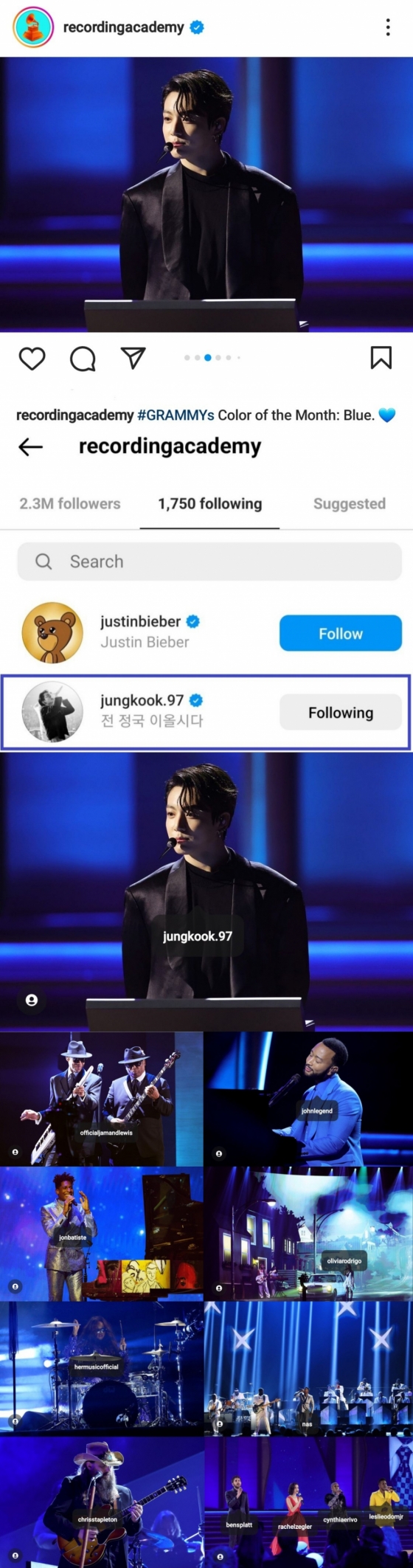 미국의 3대 음악 시상식 중 하나인 그래미 어워드(GRAMMY AWARDS)를 주최하는 그래미 공식 인스타그램 '레코딩 아카데미'(Recording Academy)는 'GRAMMYs Color of the Month: Blue'(그래미 이달의 컬러: 블루)라는 글과 함께 세계적인 스타들이 시상식 무대에서 공연을 펼치고 있는 순간이 담긴 사진들을 공개했다.