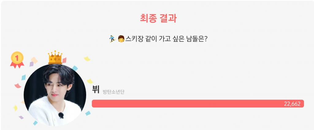 뷔는 아이돌 커뮤니티 최애돌에서 1월 5일부터 1월 12일까지 진행된 '스키장 같이 가고 싶은 남돌은?' 설문에서 2만 2662표를 획득, 1위를 차지했다.