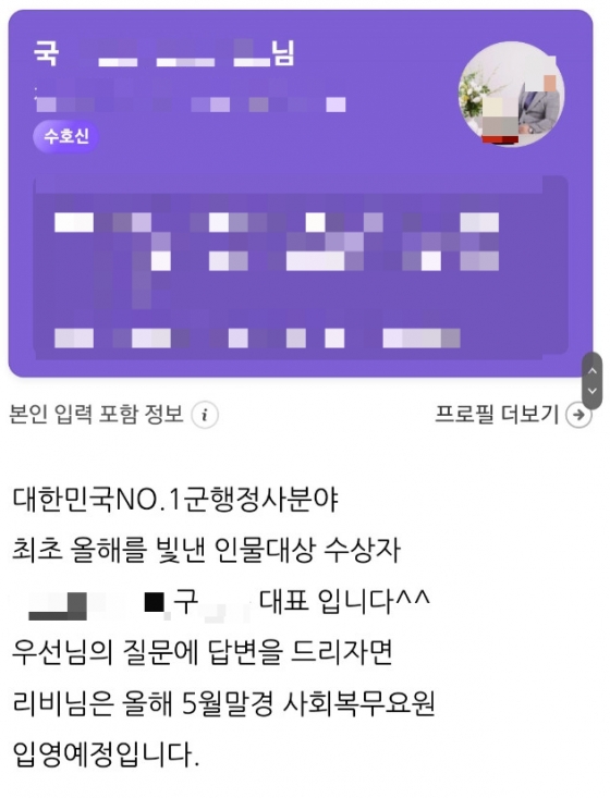 구 씨로 추정되는 인물은 해당 게시글 답변으로 "대한민국 NO.1 군행정사분야 최초 올해를 빛낸 인물 대상 수상자 군 전문지식인 구 대표다. 우선 님의 질문에 답변을 드리자면 라비 님은 올해 5월말 경 사회복무요원 입영 예정입니다"라고 밝혔다.