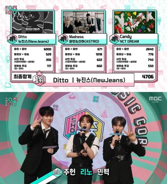 14일 오후 방송된 MBC 음악 프로그램 '쇼! 음악중심'(이하 '음중')에서는 뉴진스가 1위를 차지했다. 이날 1월 2주차 1위 후보로 뉴진스 'Ditto'(디토), 문빈&산하 'Madness'(매드니스), NCT DREAM 'Candy'(캔디)가 올랐다.