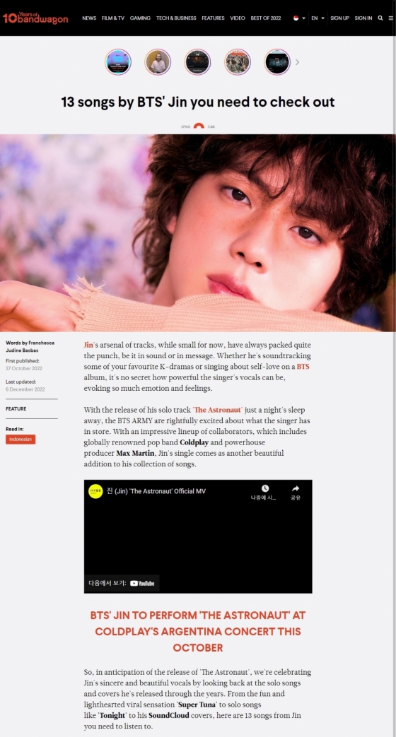 해외 음악 매체 밴드웨건(BandWagon)은 최근 '꼭 들어야 할 방탄소년단 진의 13곡'이라는 제목의 기사를 통해 진의 다채로운 음악 세계를 담아낸 솔로곡들을 소개했다.