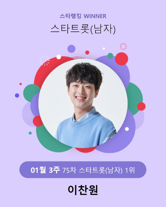이찬원은 1월 12일 오후 3시 1분부터 1월 19일 오후 3시까지 진행된 1월 3주 스타트롯 남자 랭킹 투표(75차)에서 1위에 올랐다. 이는 9주 연속 1위다.