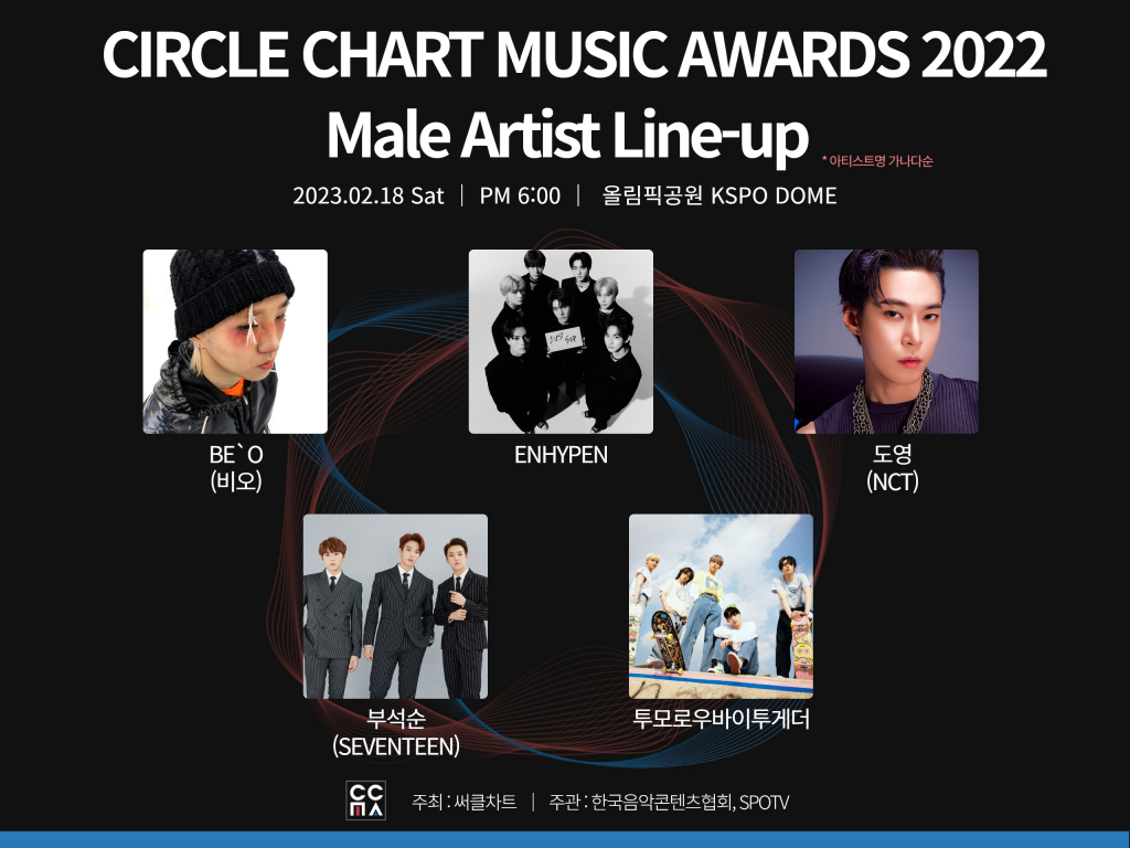 써클차트 뮤직 어워즈 사무국은 "현재까지 비오(BE`O), 엔하이픈(ENHYPEN), 도영(NCT), 부석순(SEVENTEEN), 투모로우바이투게더(가나다순)가 써클차트 뮤직 어워즈 2022 출연을 확정했다"고 27일 발표했다.