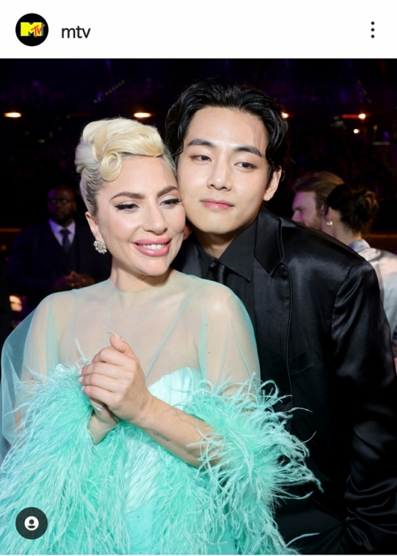 MTV는 '제64회 그래미 어워드'에서 시선을 사로잡은 아이코닉 듀오 커플에 뷔와 레이디 가가를 제일 처음 선정, 다정하게 포즈를 취하고 있는 모습을 게재했다.