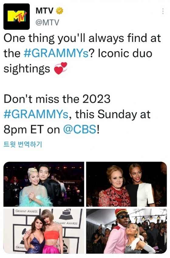 2월 5일(현지시각) 열리는 '제65회 그래미 어워드'를 앞두고 미국 음악 전문 케이블TV 채널 MTV는 "#GRAMMYs에서 항상 찾아 볼 수 있는 아이코닉 듀오"를 선정해 눈길을 끌었다.