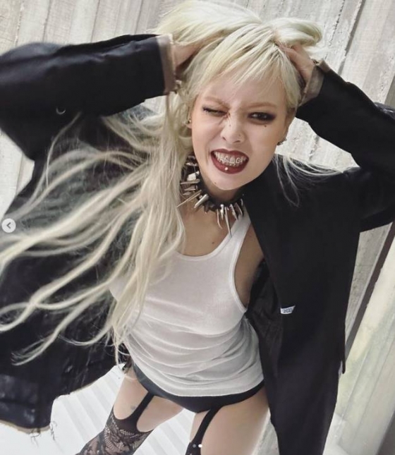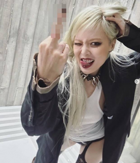 사진 속 현아는 짙은 스모키 메이크업을 하고 가죽재킷, 가죽 목걸이 등을 착용하고 강렬한 록 스타일을 선보였다.