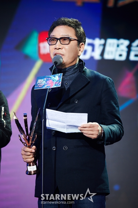 이수만 에스엠 총괄프로듀서가 지난 9일 오후 7시 중국 선전 선전완춘지엔체육관에서 개최된 제16회 음악 풍운방 연도성전에서 아시아 최고 프로듀서상을 수상하고 있다