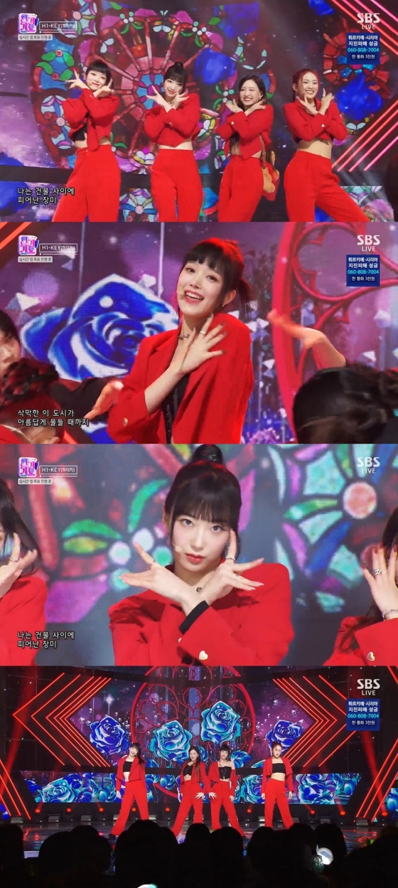이날 하이키는 붉은 레드 슈트를 입고 무대에 올랐다. 열정적인 퍼포먼스와 흔들림 없는 라이브 실력으로 시청자들의 눈과 귀를 즐겁게 만든 하이키는 오차 없는 칼군무를 선보였다.
