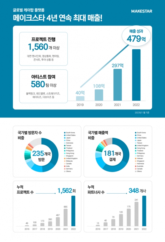 메이크스타는 전 세계 235개국에서 사용자들이 방문하고, 미국·유럽·일본·중국 등 181개국에서 매출이 발생했다. 전년대비 47개국이 더 추가되며 명실상부 최고 글로벌 플랫폼으로 자리매김했다. 해외 매출 비중이 약 70%에 이른다.