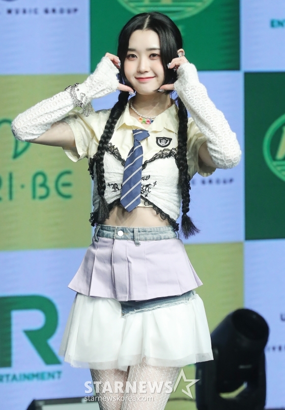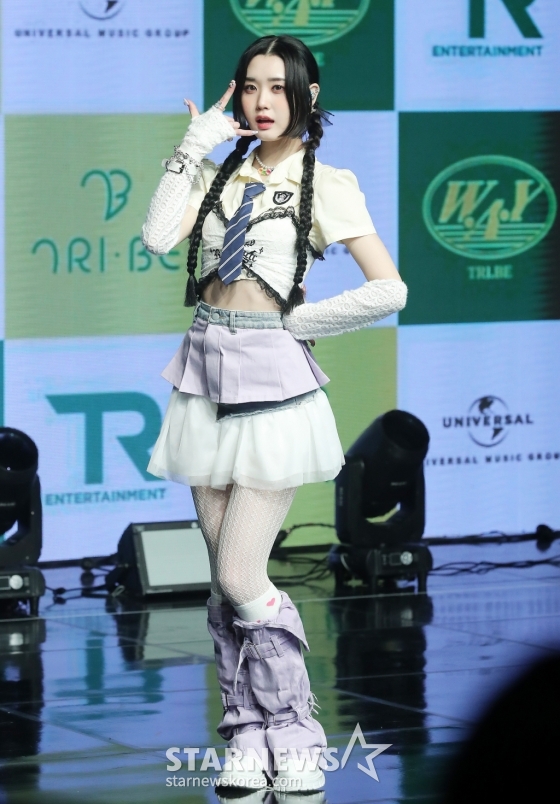 걸그룹 트라이비(TRI.BE) 미레가 14일 오후 서울 강남구 청담동 일지아트홀에서 진행된 두 번째 미니앨범 'W.A.Y(웨이)' 발매 기념 쇼케이스에 참석해 포즈를 취하고 있다.