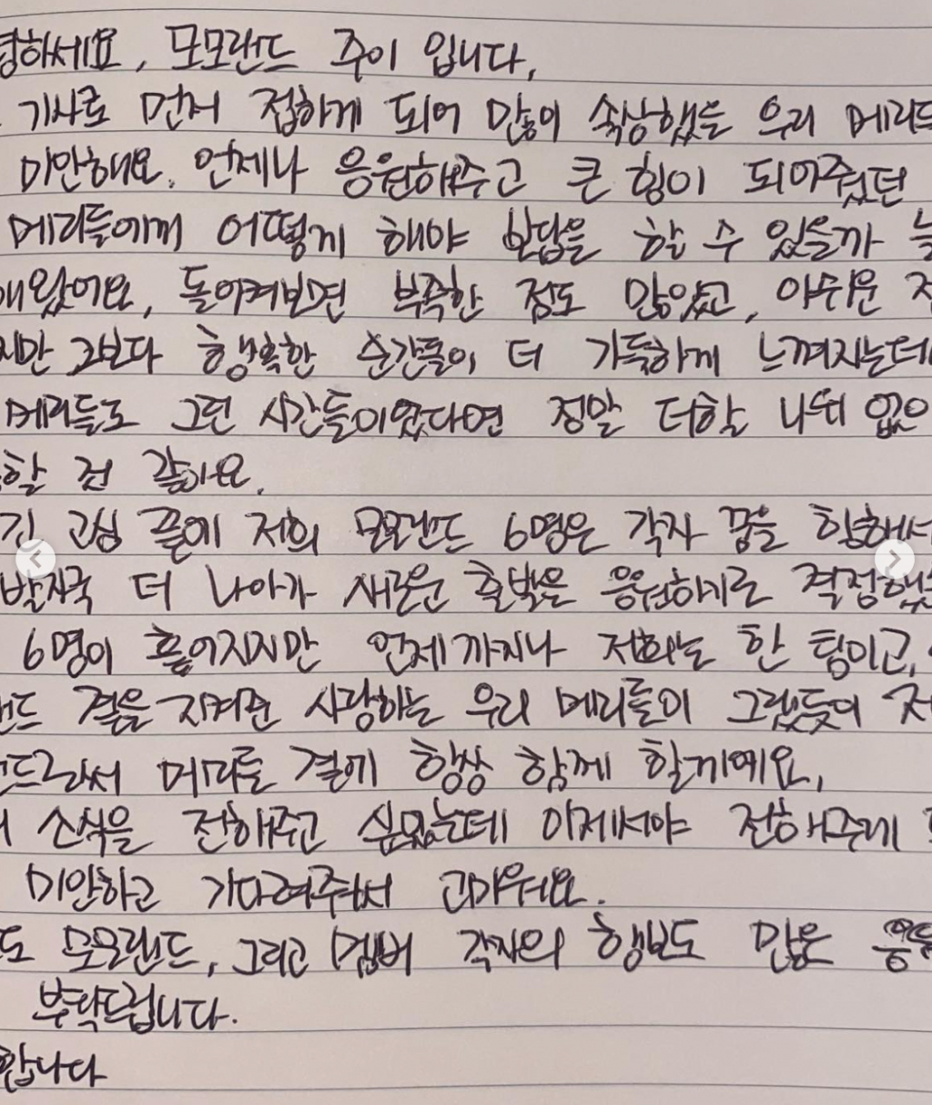 이어 "비록 6명이 흩어지지만 언제까지나 저희는 한 팀이고, 언제나 모모랜드 곁을 지켜준 사랑하는 우리 메리들이 그랬듯이 저희도 모모랜드로써 메리들 곁에 항상 함께 할 거예요. 빨리 소식을 전해주고 싶었는데 이제서야 전해주게 돼서 너무 미안하고 기다려줘서 고마워요. 앞으로도 모모랜드, 그리고 멤버 각자의 행보도 많은 응원과 기대 부탁드립니다"라고 전했다.