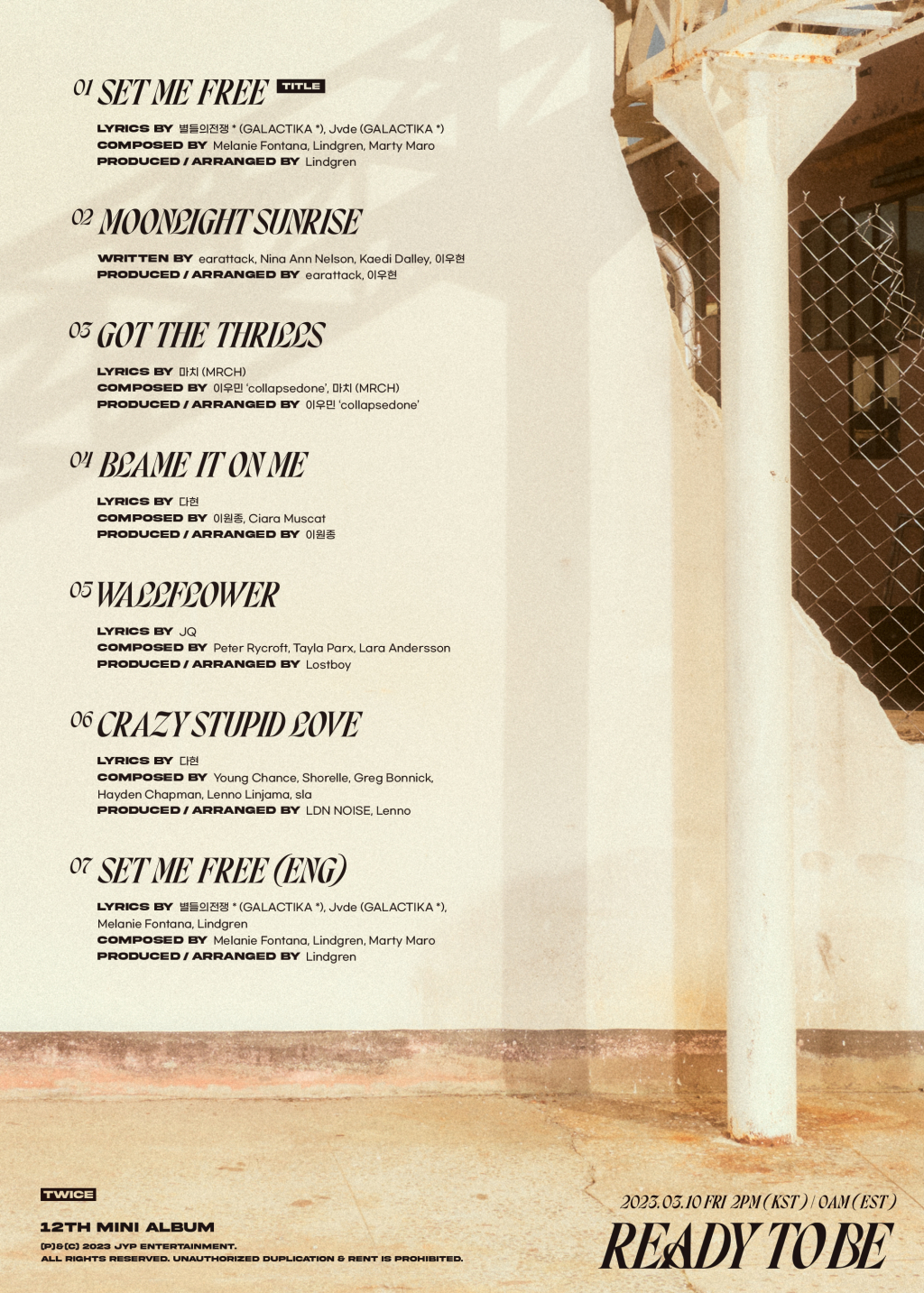 한편 트와이스의 미니 12집 'READY TO BE'와 타이틀곡 'SET ME FREE'는 3월 10일 오후 2시(미국 동부시간 기준 0시) 정식 발매된다.