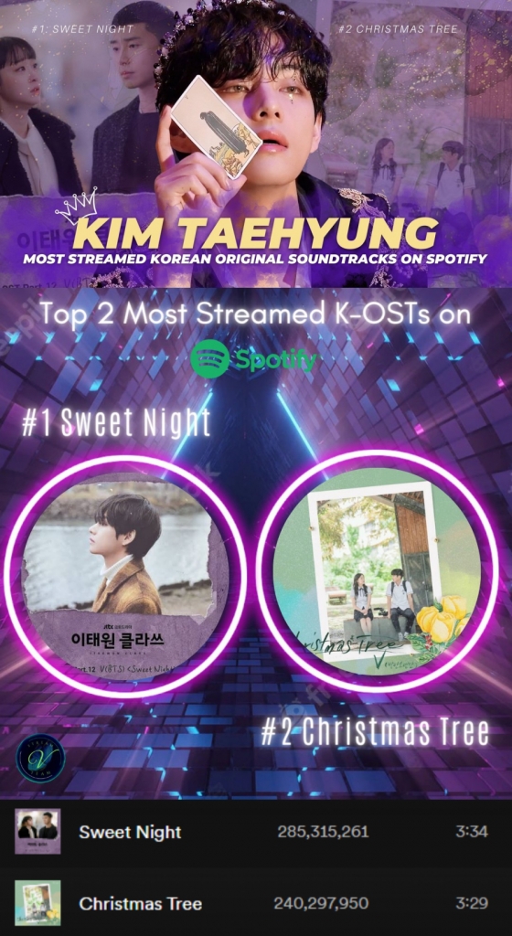 '역대 스포티파이 K-OST 스트리밍 랭킹' 1위 곡은 드라마 '이태원 클라쓰'의 OST 'Sweet Night'으로, 역시 뷔의 곡이다. 2월 17일 현재 2억 8500만 스트리밍을 기록 중이다.