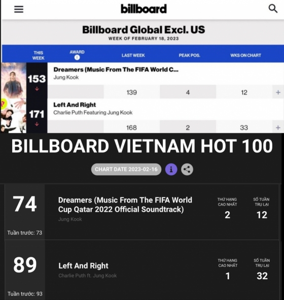 'Dreamers'와 'Left and Right'는 2월 16일 자 빌보드 베트남 '핫100'에 74위, 89위로 12주, 32주째 랭크됐다.