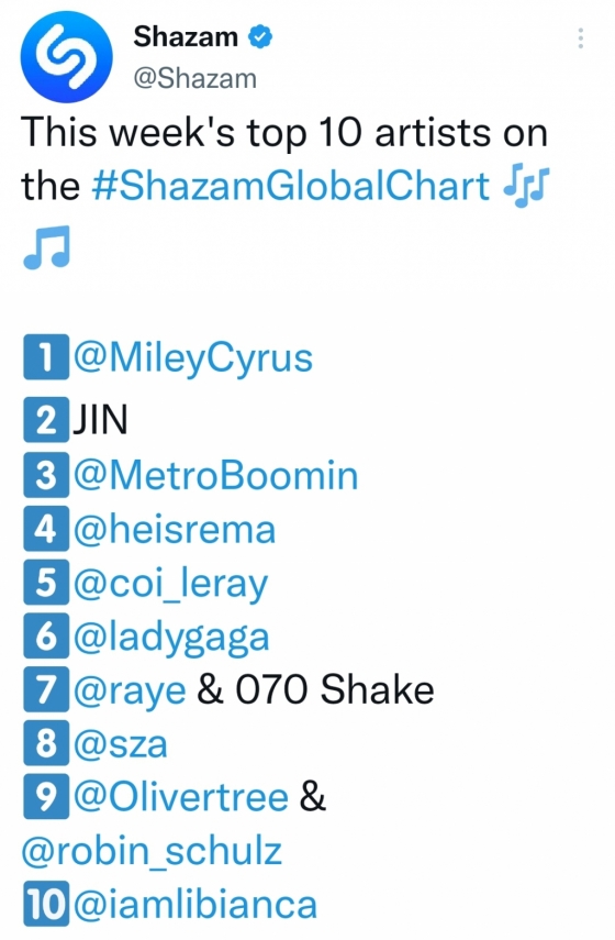 진은 세계 최대의 음원 검색 플랫폼 샤잠(Shazam)이 2월 17일 공식 SNS 계정을 통해 발표한 '글로벌 주간 톱10 아티스트'에서 2위에 이름을 올렸다. 진은 전 세계를 무대로 하는 탑 가수들과 어깨를 나란히 하면 글로벌 슈퍼스타 존재감을 보였다.